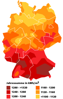 In Deutschland beträgt die Strahlungsintensität durchschnittlich 50 % derer, welche auf die Sahara trifft. Somit summiert sich bei uns die eintreffende Sonnenenergie im Jahr durchschnittlich auf 1.000 Kilowattstunden (kWh) pro Quadratmeter. Dabei liegt die Einstrahlung im Süden Deutschlands lediglich zehn Prozent höher als die im Norden. In Hamburg gibt es sogar durchschnittlich mehr Sonnenstunden als am bayrischen Tegernsee, und die Ostsee-Insel Usedom ist der sonnenreichste Ort Deutschlands.