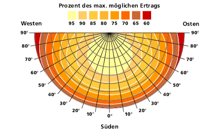 Den voraussichtlichen Energieertrag einer PV-Anlage können sie anhand der geografischen Ausrichtung (Süden, Osten, Westen) und der Dachneigung (10 bis 90 Grad) bestimmen. Einen optimalen Ertrag erzielen Sie im "hellen Farbbereich". Je weiter Sie außen liegen, desto geringer die Ausbeute.